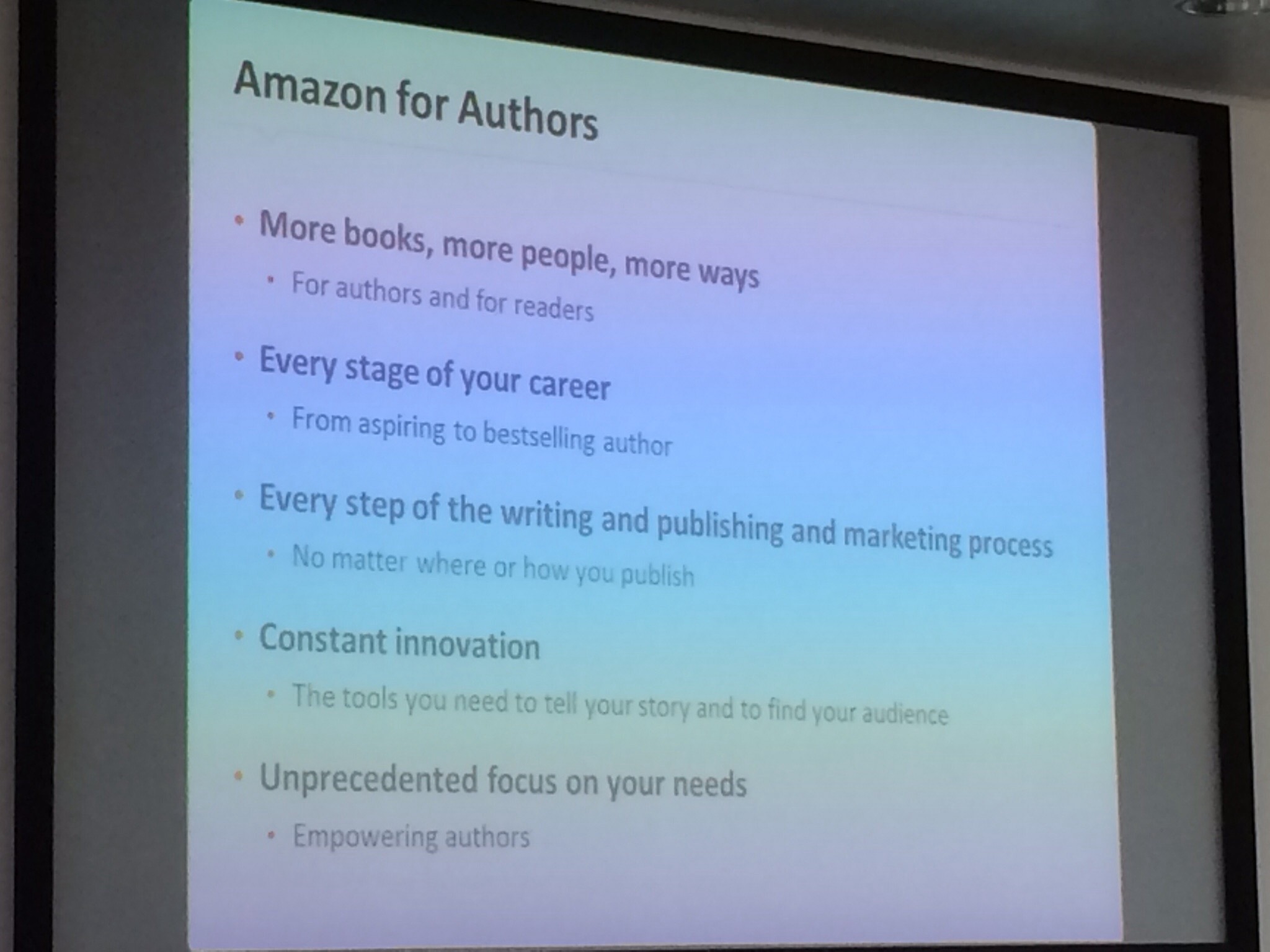 Jon rounded up his talk by pointing out that Amazon itself is also a publisher and frequently brings on authors who may have started via the self-publishing route.