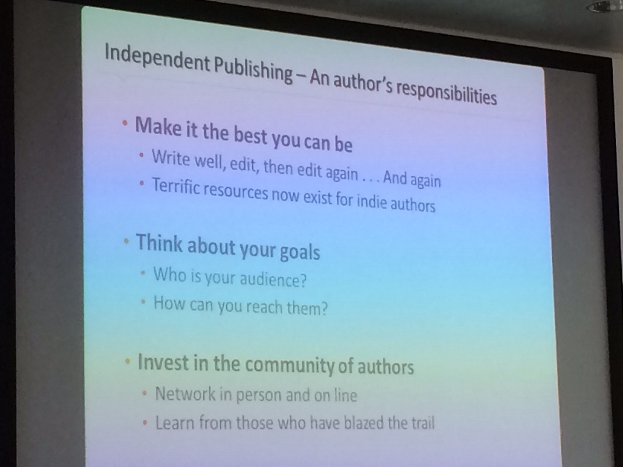 • Ensure your content is as good as it possibly can be. The audience roared when she quoted Joe Konrath: “Don’t write crap“!