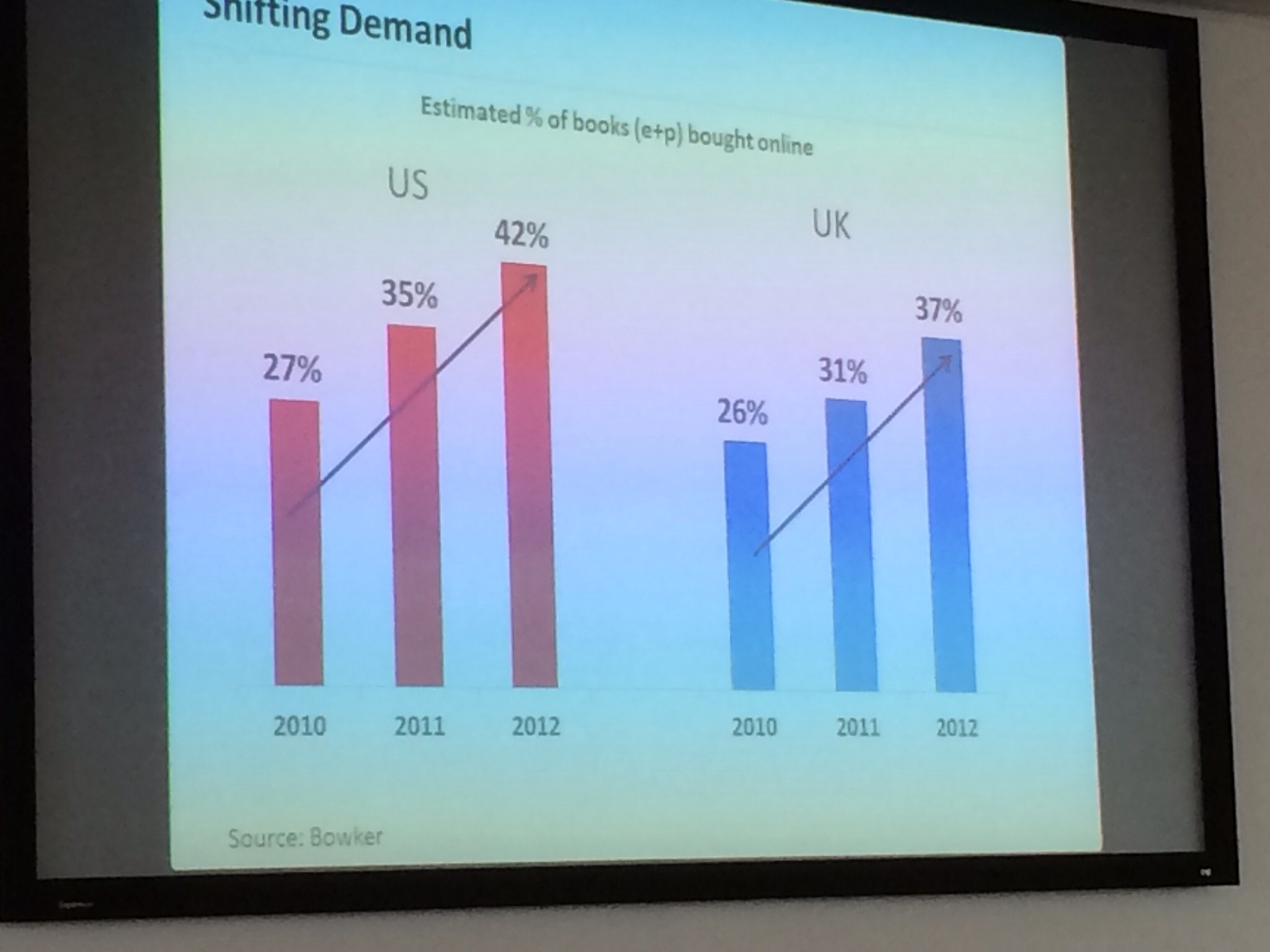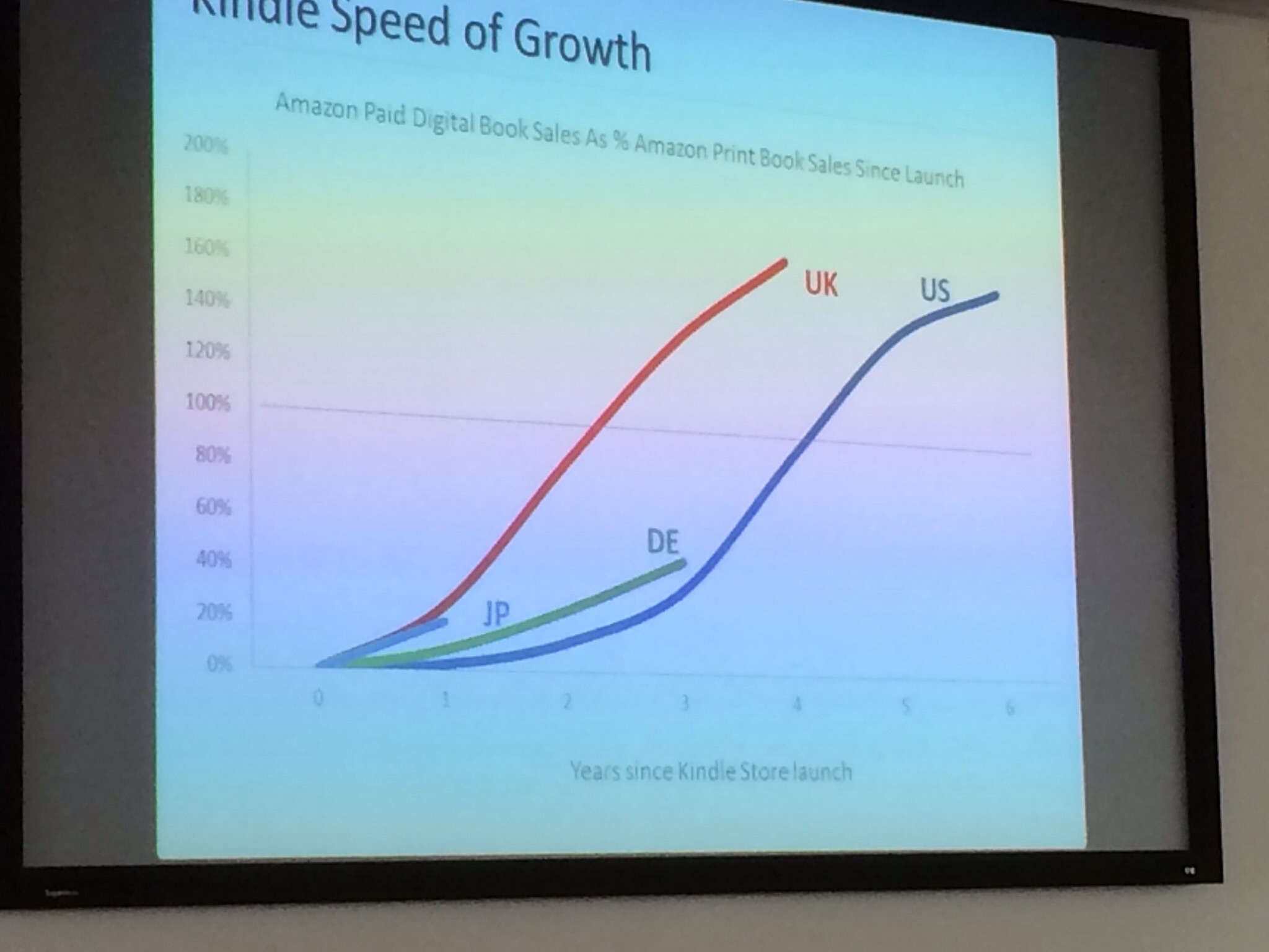 Jon came prepared with a lot of impressive statistics about the growth of Kindle as a platform both here in the UK and in the US, with Germany next in the growth charts. He raced through his enormous Powerpoint presentation which could have easily  run for a couple of hours, so I took photos of as many as I could to give you the opportunity to read and digest them. [Slide show will open in a new window.]